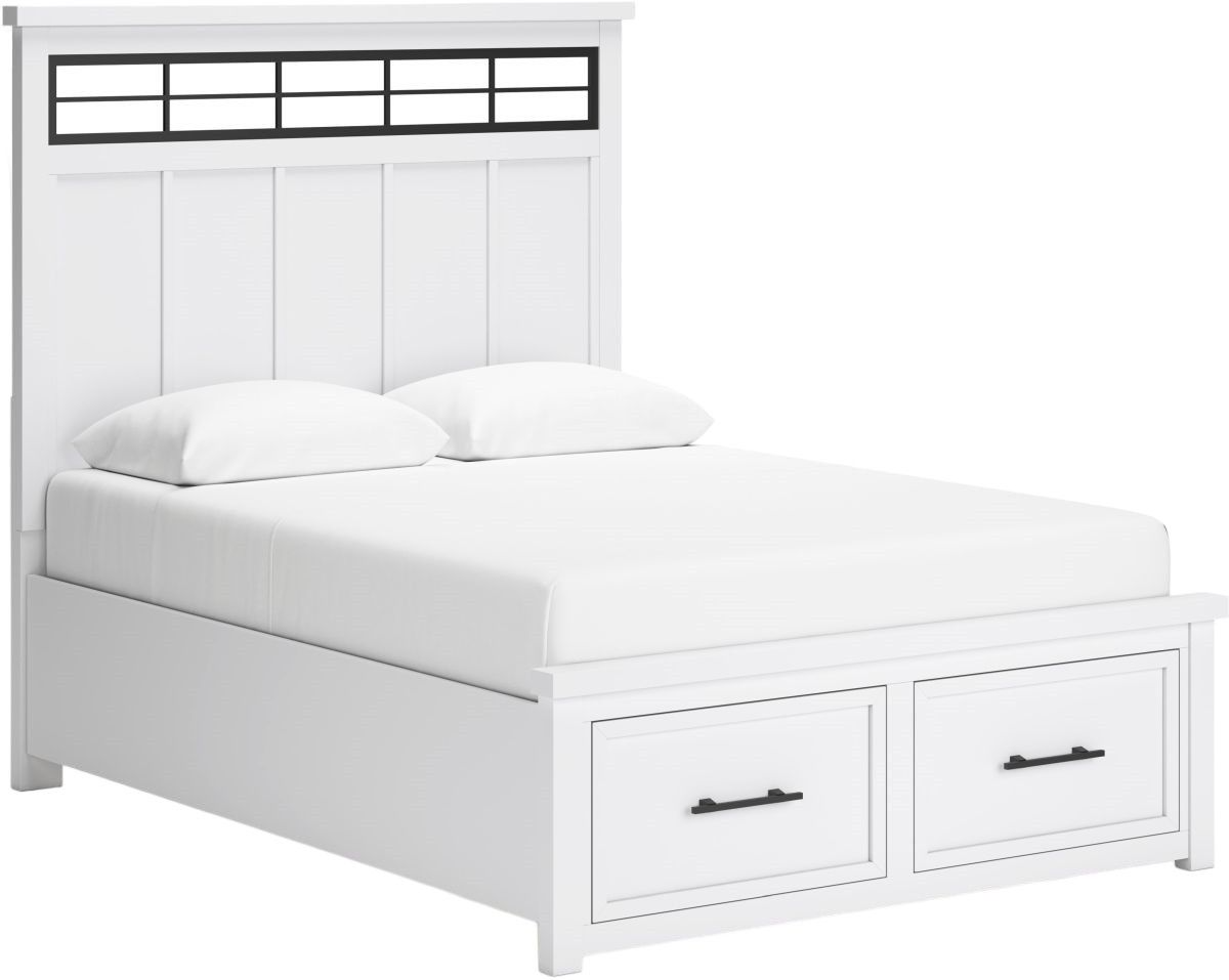This queen panel storage bed delivers casual style with substance. An inset metal detail on the headboard displays a unique take on modern farmhouse design. The bed's sturdy silhouette, classic white finish and black pulls exude a comfortably cozy vibe in your soothing sanctuary. Storage drawers are spacious enough for all your essentials.Read More
