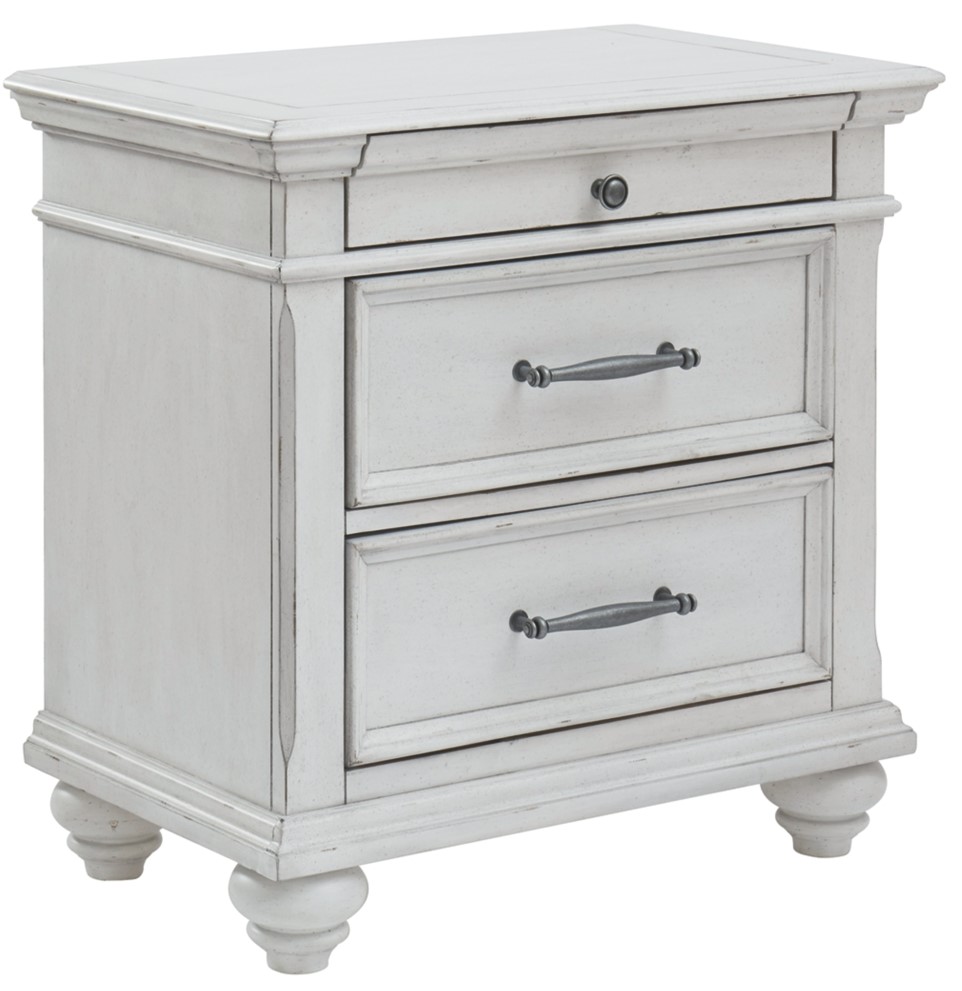 Give your retreat vintage charm and valuable bedside storage with the Kanwyn 3-drawer nightstand. In a beautifully distressed whitewashed finish, two drawers and a smaller top accessory drawer will help you keep bedtime essentials nearby in casual style. Generously scaled moulding from top to bottom, along with bun feet and drawer handles with a transitional aesthetic, give this nightstand character—invoking the feel of a quaint cottage escape.