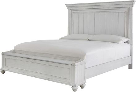 Give your retreat vintage charm with this queen panel bed with storage bench footboard. In a beautifully distressed white-washed finish, you'll love the headboard's grand style featuring a picture framed panel. The bench footboard is equally elegant offering extra storage and a convenient seat. Generously scaled moulding from top to bottom, along with bun feet give this bed character—invoking the feel of a quaint cottage escape. Assembly required for this product.Read More