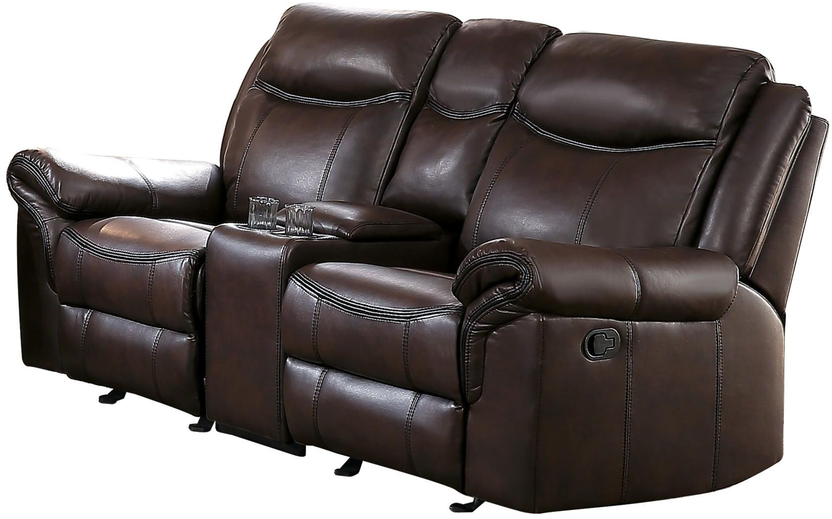 The seating group is offered in a brown fabric or dark brown Aire Hyde for comfort and style that will blend effortlessly with your transitional decorative preference. Manual motion mechanisms operate with the pull of a side-mounted tab, that once engaged, take you from seated to reclined in an easy motion. Each piece in the collection has an individual function allowing for convenience and comfort. The sofa features dual reclining ends and a drop down center seat back with cup-holders, electric receptacles, USB port and tabletop space, the dual glider reclining ends of the Loveseat flank a center mounted console with storage, electric receptacles and cup-holders, and the reclining chair features a glider mechanism that allows for easy back and forth motion.