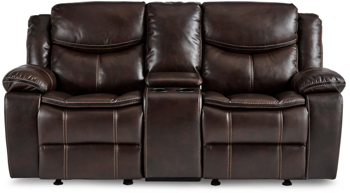 The two optional coverings – black or brown leather gel match – feature contrast welting for definition of profile and modern accenting. Manually engaged motion mechanisms allow for quick transition from seated to prone with the quick pull of a tab. Each piece in the collection has an individual function allowing for convenience and comfort. The sofa features dual reclining ends, the dual glider reclining ends of the Loveseat flank a center mounted console with storage and cup-holders, and the chair features a glider mechanism that allows for easy back and forth motion. The sectional configuration features a left side loveseat with reclining end and the right side double reclining loveseat with center console unit featuring cup holders and storage.