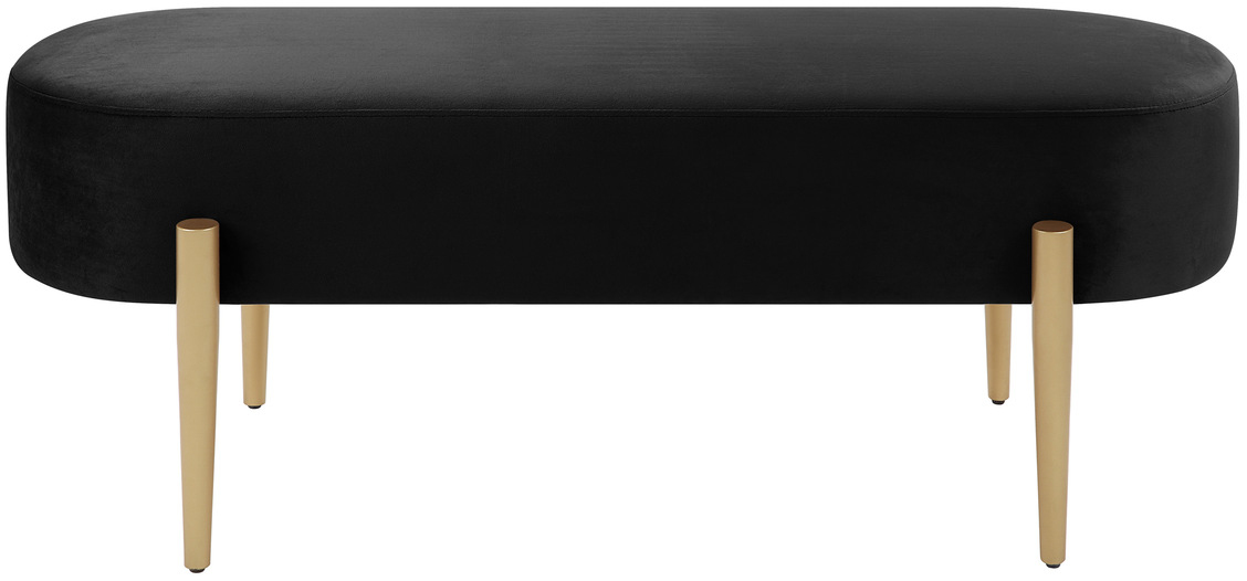 The Cara Collection brings the glamorous stylings of velvet and gold to the clean look of Mid-Century Modern design. The Cara oval accent bench is draped with plush velvet in your choice of navy, black, or grey, providing a luxurious look on top of remarkably comfortable padding, all while resting atop a stylish gold-painted frame.Read More