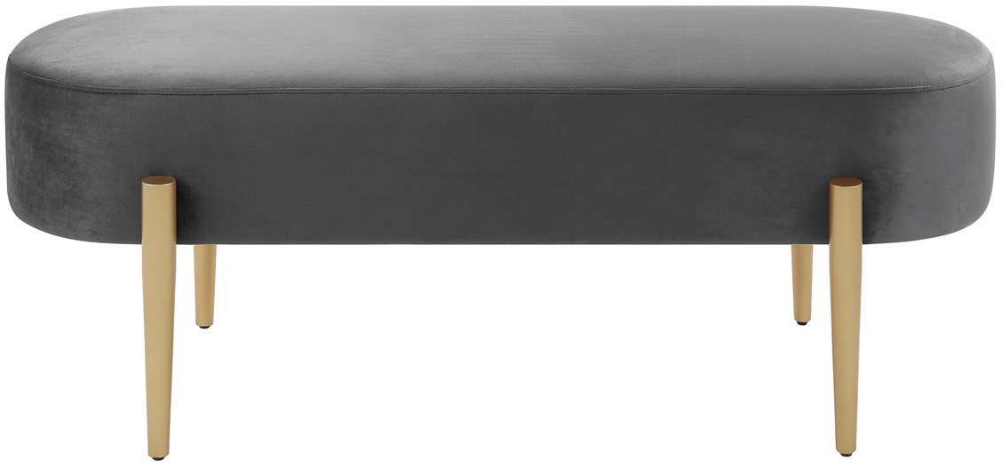 The Cara Collection brings the glamorous stylings of velvet and gold to the clean look of Mid-Century Modern design. The Cara oval accent bench is draped with plush velvet in your choice of navy, black, or grey, providing a luxurious look on top of remarkably comfortable padding, all while resting atop a stylish gold-painted frame.Read More