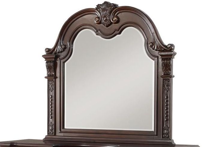 The Cavalier Collection exemplifies the finest in Old World European design inspiration. Egg and dart base moldings, bead molding, acanthus leaf carvings, and genuine marble insert tops all blend to achieve an elegant addition for your traditional home. The grand sleigh bed features a bi-cast vinyl, button-tufted headboard insert. Each of the collection’s beautiful detail is accented by the dark cherry finish on birch veneers with gold highlightsRead More