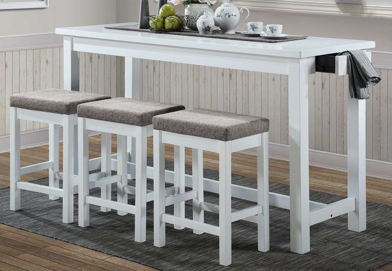 The elevated dining experience that the Connected Collection provides will fuel your device's battery life while you fuel yourself. The convenience of built-in USB ports and A/C power turns your casual dining area into an efficient recharging station. The four-piece pack of the Connected Collection includes a counter height table and three barstools. A single drawer allows for discrete storage on the table's side apron. As a neutral palette for your decorate preference, the collection features a white finish, with the neutral gray tone of the barstool's seats providing subtle accent.