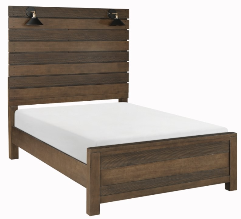 Mounted on the upper slat of the Eastern King panel headboard are the LED lights with black and brass finished lampshades, each providing additional light sources within your bedroom and further lending to the rusticated aesthetic of the collection.