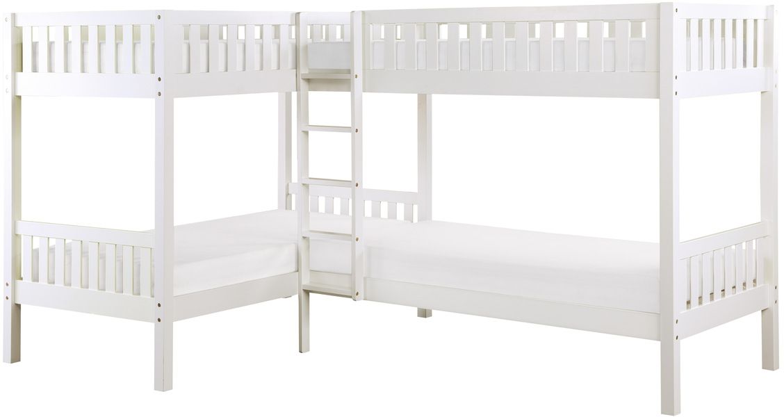 Maximizing sleep space is achieved with the stylish Galen Collection. This transitional corner bunkbed is featured in a white finish making it an appropriate choice for a number of youth bedroom settings. The four twin beds that comprise the unit conjoin to fit perfectly within your available space.Read More