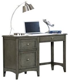 The writing desk’s distinct framing along with a cool gray finish, over birch veneer, combine to provide a clean palate for your personal decorative style. Nickel knob hardware provides subtle, yet distinct, contrast to the drawer fronts. The keyboard tray and drawer storage provide additional functionality beyond the desk top.Read More