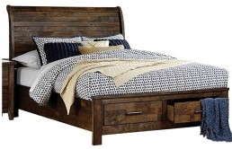 Metal hardware furthers the authentic rustic look of the queen platform storage bed while a burnished finish serves to highlight the wood grain while allowing each plank to serve as a unique accent to the design. The drawers of the footboard allow for extra storage space within your bedroom.Read More
