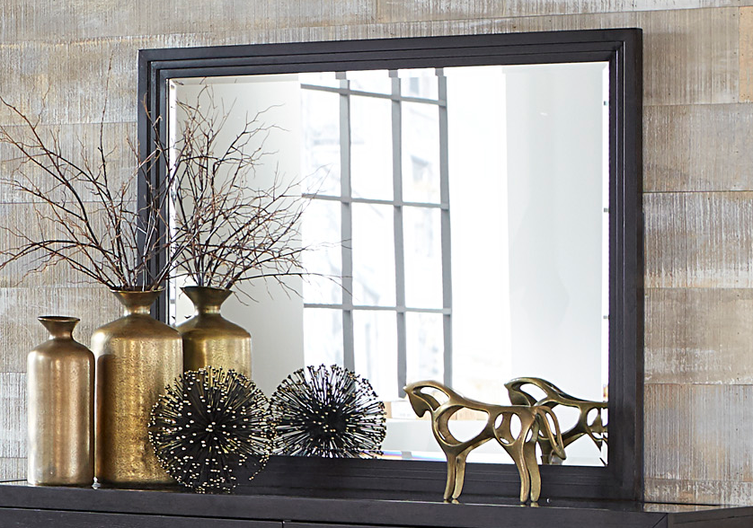 The striking profile of the Larchmont Collection is an intersection of texture, material and style. The charcoal upholstered bed, that centers the collection, features pin-tucked button tufting and nailhead accent. Dark glass tops nightstand and dresser for subtle reflection and textural interest. Prominent horizontal metal hardware is mounted on each drawer front, and is finished to complement the tone of the charcoal finish over ash veneer. The night stand open concept of the drawer features not only the aforementioned glass top, but also underside LED lighting and power strip – with USB port- for the ultimate modern touch.Read More