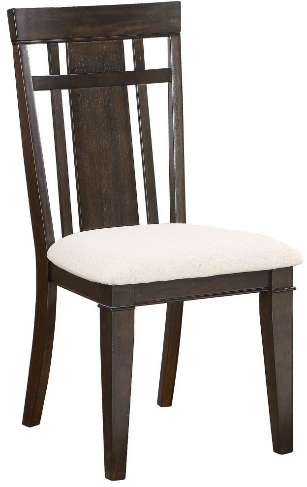 The look of Arts and Crafts styling is updated for the modern home in the Makah Collection. Classically framed chairs pair with the tapered leg table to create this casual dining look. A dark brown finish highlights the wood veneer allowing for the neutral tone of the seats to blend with little effort. The drawers of the server, table apron and chairs feature framing that lends accent to the classic look. The accompanying server features a double wine rack as well as drawer and behind door storage.Read More