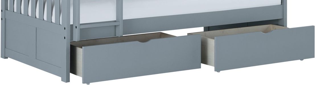 The transitional design of the Orion Collection’s underbed dual toyboxes - featured in a gray finish- makes it a functional addition to your chosen bed selection. Also available: twin over twin bunkbed, twin over full bunkbed, full over full bunkbed, twin over twin trundle bed with two built-in drawers, trundle, dresser and mirror. Providing flexible options to fit any size bedroom is the Orion Collection. This transitional bedroom group is featured in a grey finish making it an appropriate choice for a number of youth bedroom settings. With twin over full, twin over twin, full over full configurations, captains bed with a trundle that features two drawers, and twin/ twin bunk with storage stair steps – the collection’s design allows you to choose the size that is right for your family. Two under bed options are also available for the bunk beds – dual toy boxes or pull-out trundle. Additional storage comes in the form of the coordinating dresser, mirror, chest and nightstand.