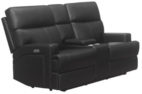With a streamlined profile and contemporary design, the Sethos power reclining collection offers a fresh, clean look for your living room. Buttery soft top grain leather upholstery in classic black covers the front of this console loveseat, while high quality PVC leather match drapes the outer sides and back.Read More