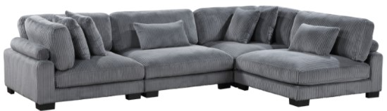 Configurable to your available space, the Traverse Collection allows for the addition and detachment of pieces for a customized seating experience. The 4-piece sectional configuration consists of two corner units paired with two armless chairs. The gray corduroy fabric upholstery creates a plush expanse for a soft touch experience.Read More
