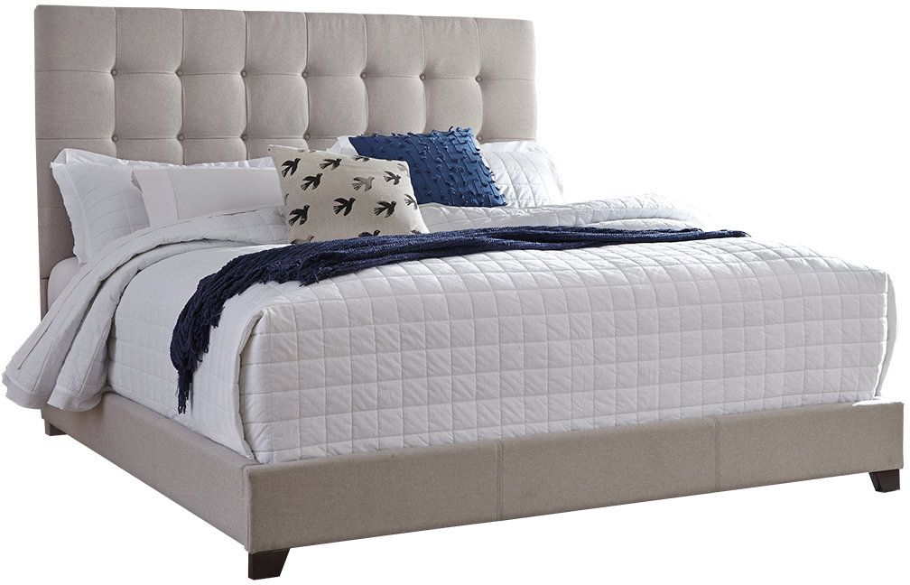 This king upholstered bed is sure to awaken a love for modern platform styling with a softer side. Plush to the touch and so easy on the eyes, a pale beige fabric hugs the bed—from the chic headboard with square button tufting, to the low footboard and side rails.Read More