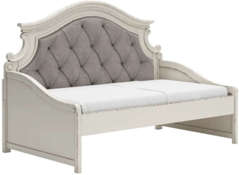 Elevating the art of traditional cottage styling, this darling day bed is your dream bedroom retreat realized. A curvaceous beauty, the plushly upholstered headboard wows with dramatic scalloped details and fanciful trim work. The distressed chipped white finish charms with its heirloom appeal.Read More