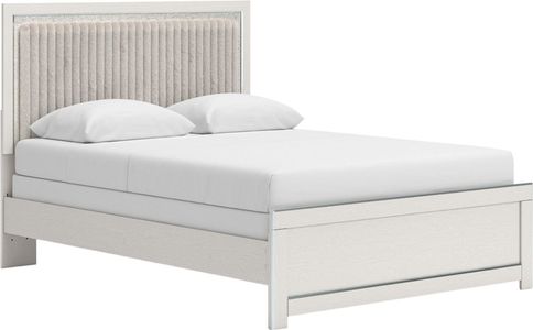 Includes upholstered panel headboard, panel footboard, platform rails and roll slats